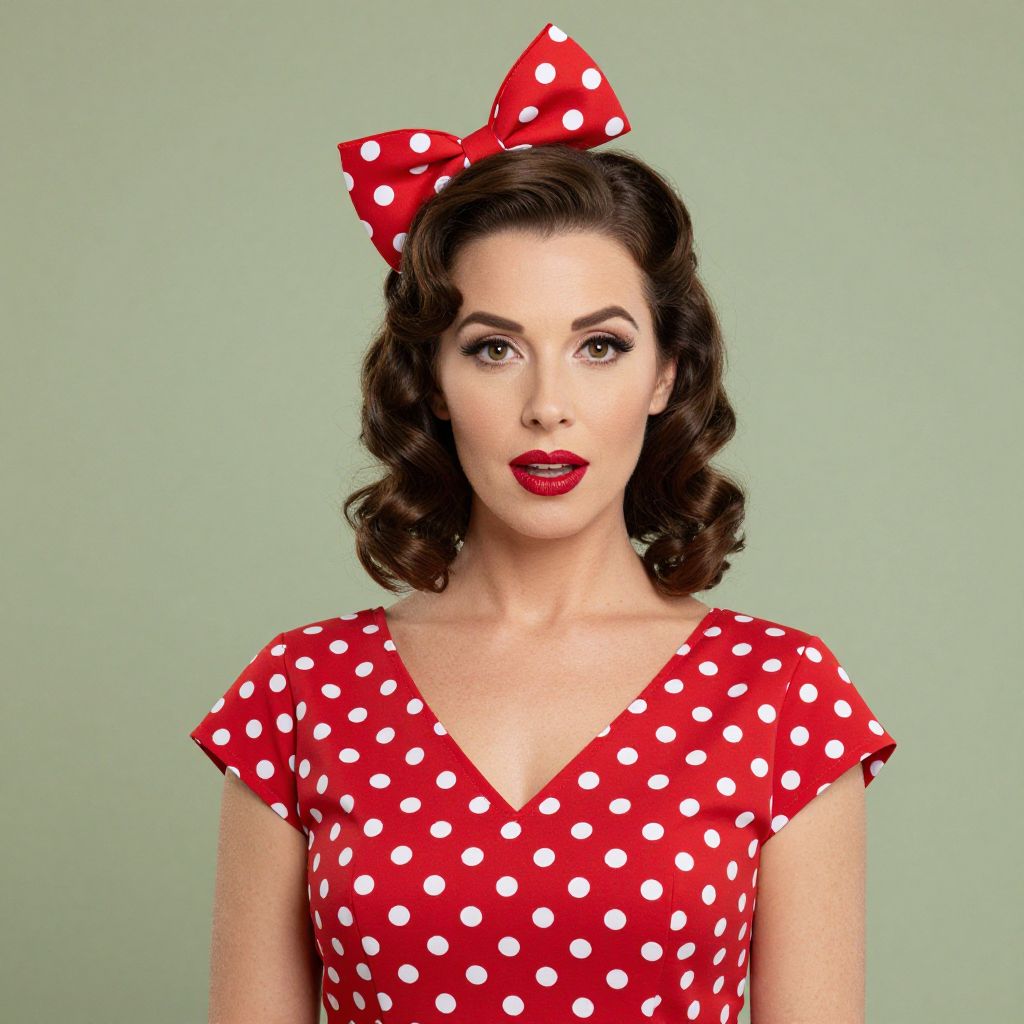 Woman wearing a vibrant red polka-dot dress and matching hair bow, showcasing classic 1950s style with perfectly curled hair and bold makeup against a soft green backdrop.