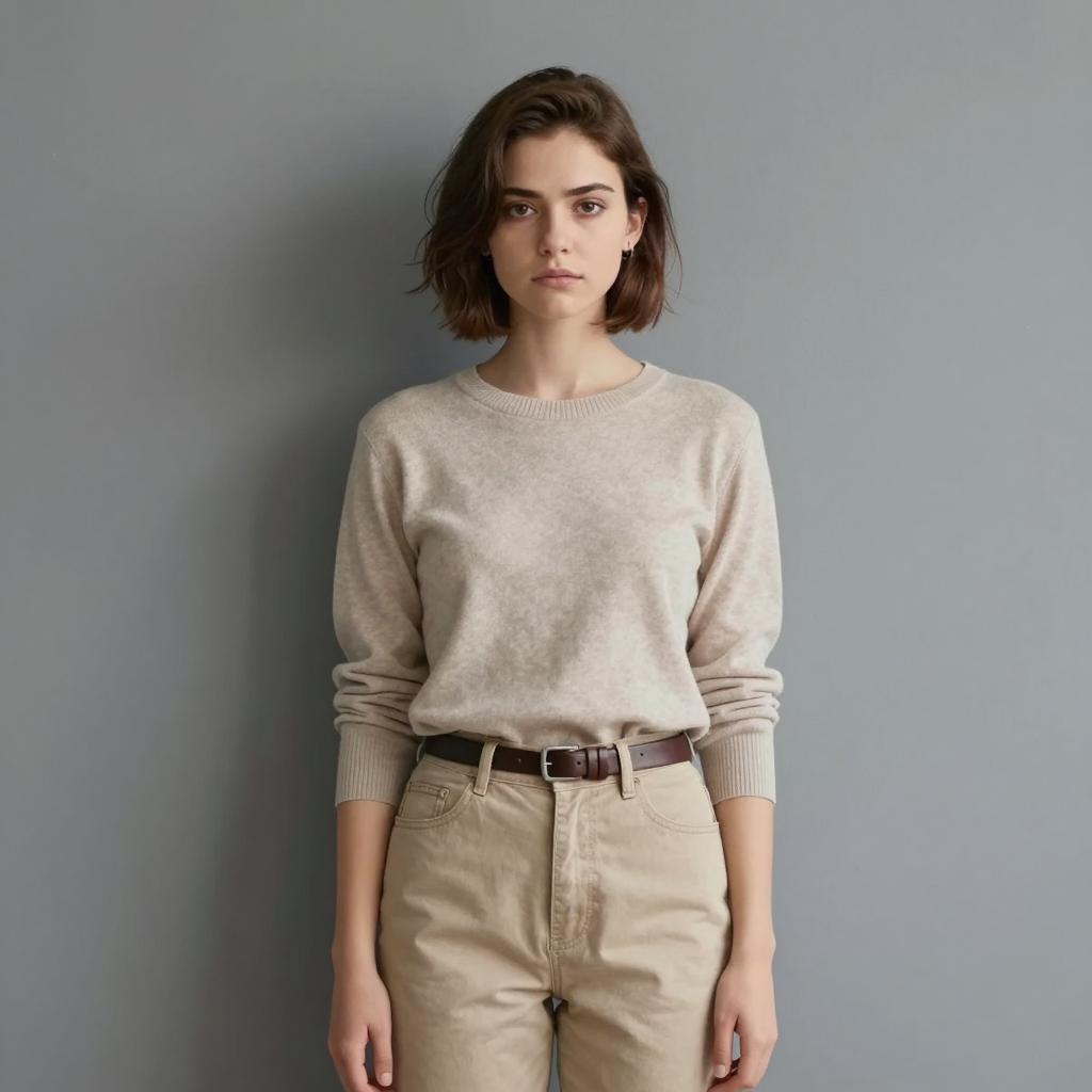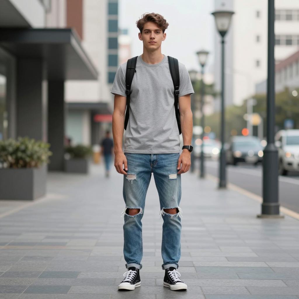 Going out tops wear jeans, photorealistic, young woman, standing in arched hallway, casual outfit, blue jeans with ripped knees, tan boots, gray turtleneck, blue denim jacket, gray scarf, backpack, hair in bun, serious expression, soft light, background blurred people, urban setting, daytime, realistic ures, symmetrical composition, detailed clothing, contemporary fashion, balanced colors