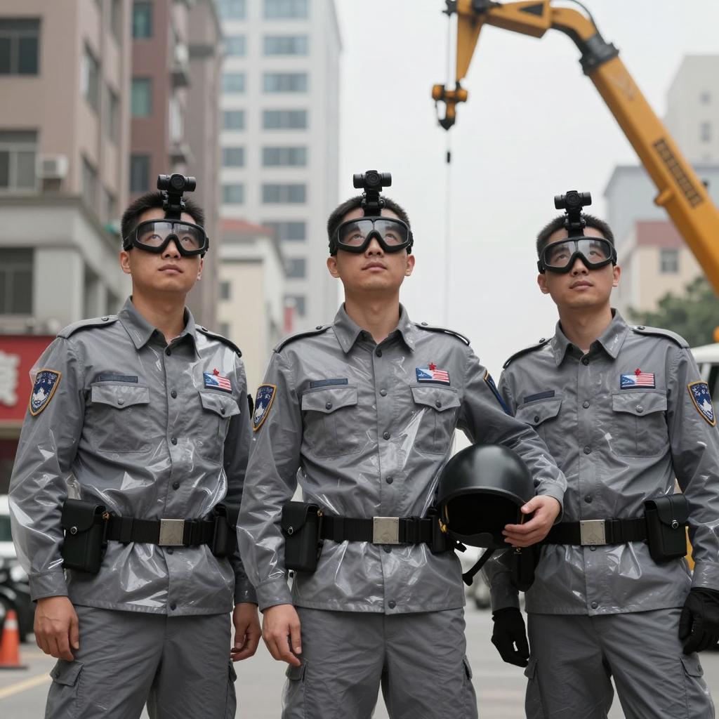 Three male soldiers in grey military uniforms with red armbands and name tags, standing in a row. Each holds a black rifle, facing forward. Dark background. All have short, dark hair, neutral facial expressions. Black rifles in front. Soldier on right has a slight upward glance.