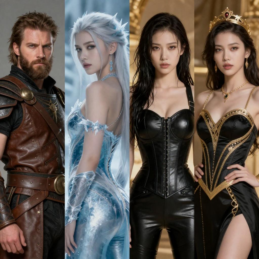 Photograph of four characters. Left: rugged man with beard, brown leather armor, serious expression. Center-left: woman with silver hair, ice-themed outfit, back turned, intense gaze. Center: woman with wet hair, black leather corset, serious expression. Right: woman with golden crown, intricate black and gold dress, confident gaze. Backgrounds: icy, gold, ured. All characters stand in separate sections.