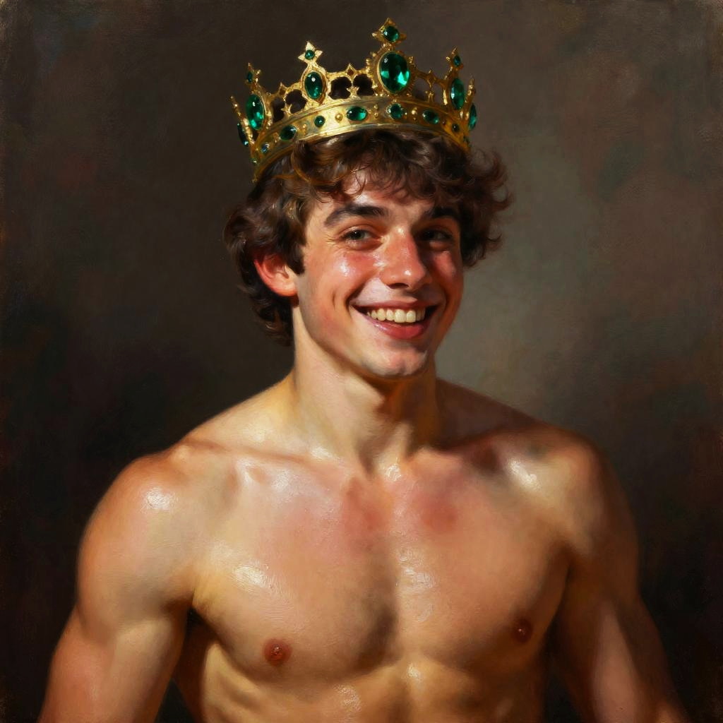 This is a digital painting of a young, shirtless male with a light skin tone and wavy, blonde hair. His expression is serious and slightly pensive. The lighting creates a dramatic, almost glowing effect on his smooth, muscular chest and shoulders. The background is dark and textured, contrasting with his illuminated figure. The style is reminiscent of classical realism with a modern digital twist.