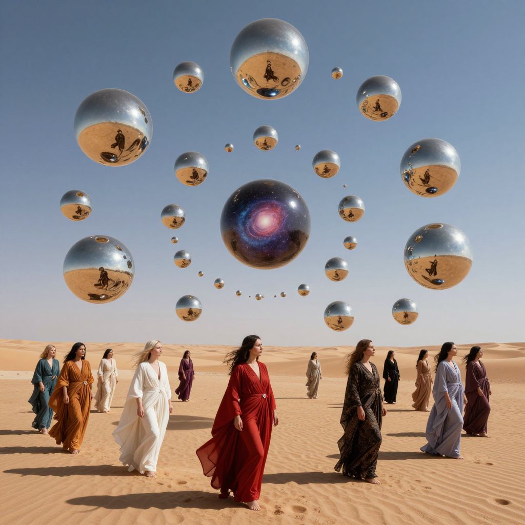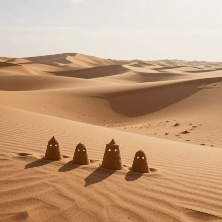 Photograph of five men in traditional Middle Eastern attire with face masks, sitting cross-legged in a bright orange desert with rolling sand dunes under a clear