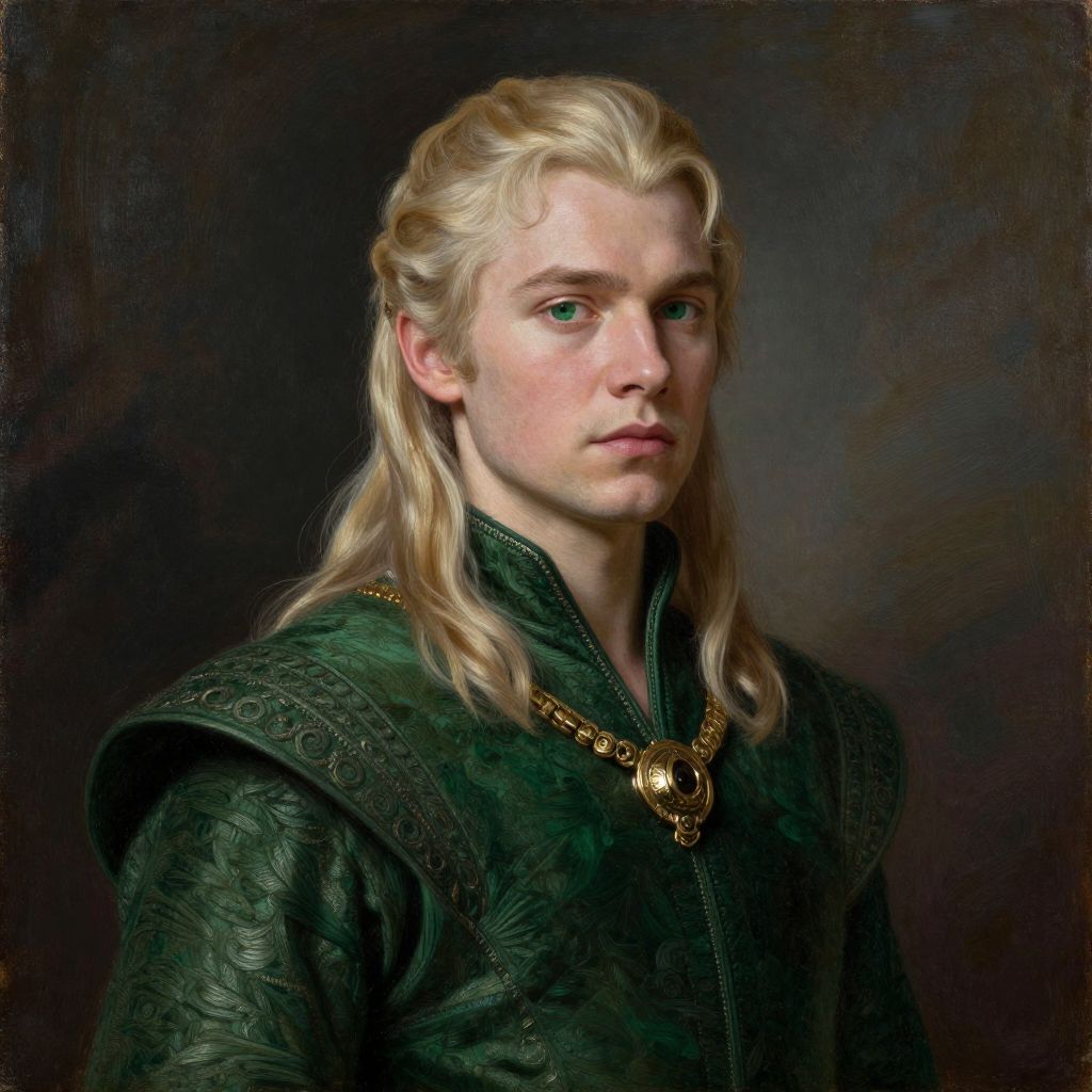 Astrobiology Royal, noble, king, prince, emporer, medieval, green clothing, green eyes, blond hair, man, white skin, 20 year old, oil painting, portrait, game of thrones, house of the dragon,