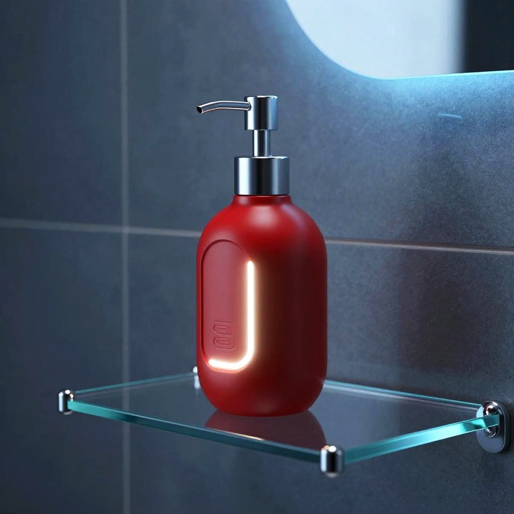 Futuristic red soap dispenser with LED glowing accents, set on a transparent glass shelf, high-tech bathroom interior, cool blue lighting contrast, hyper-detailed