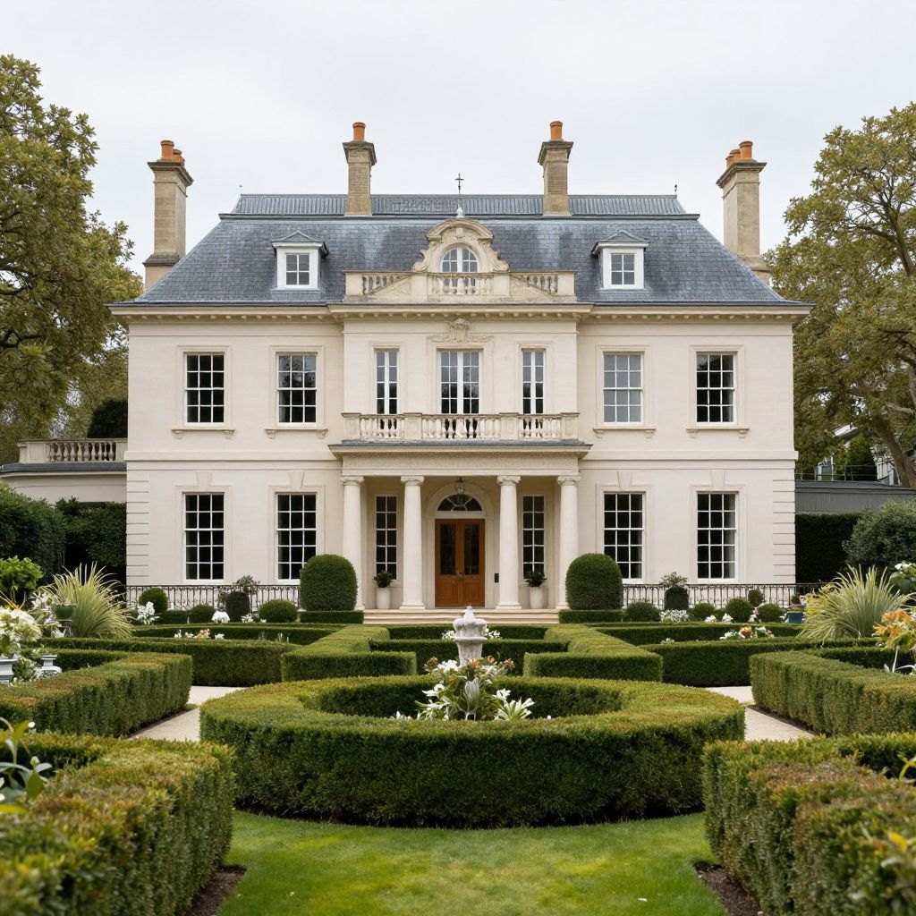 Photograph of a grand, symmetrical, cream-colored Georgian mansion with a slate roof, central balcony, and manicured, rectangular hedge garden.