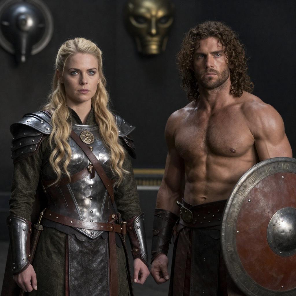 Photograph of two people in ancient warrior attire. Muscular man with long brown hair, dark fur shoulder guards, and black loincloth, standing left. Blonde woman with long hair, silver armor, and dark fur skirt, standing right, touching his chest. Sword on man's back. Grass and greenery background. Woman holds small green plant. Man looks down, woman looks up at him. Both have intense expressions.