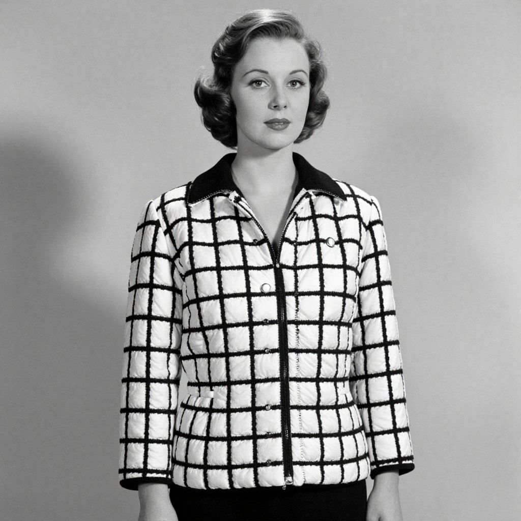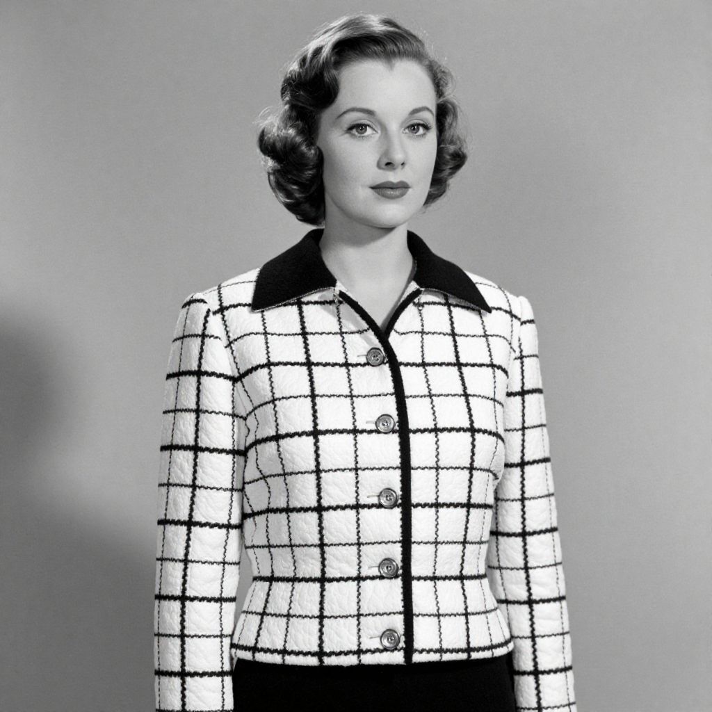 Black-and-white photograph of a 1950s-style woman with wavy hair, wearing a white checkered blazer with black buttons and collar.