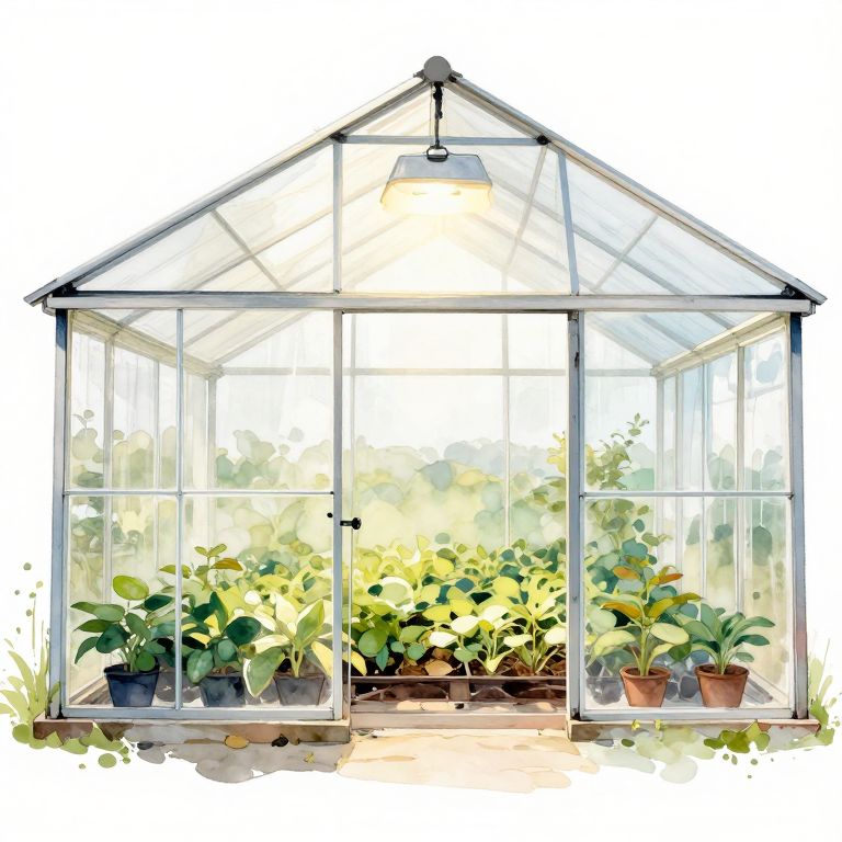 This is a digital watercolor-style illustration of a small, transparent greenhouse with a triangular roof. The greenhouse is composed of clear glass panels framed in white metal, allowing sunlight to illuminate the interior. Inside, there are several potted plants with vibrant green leaves, including larger, leafy plants in the center and smaller plants in pots on the left and right sides. The pots are black and brown, and the soil appears dark brown. The background outside the greenhouse is softly blurred with shades of green and yellow, suggesting a garden or outdoor setting. The overall scene is bright and cheerful, emphasizing the growth and health of the plants within the greenhouse.