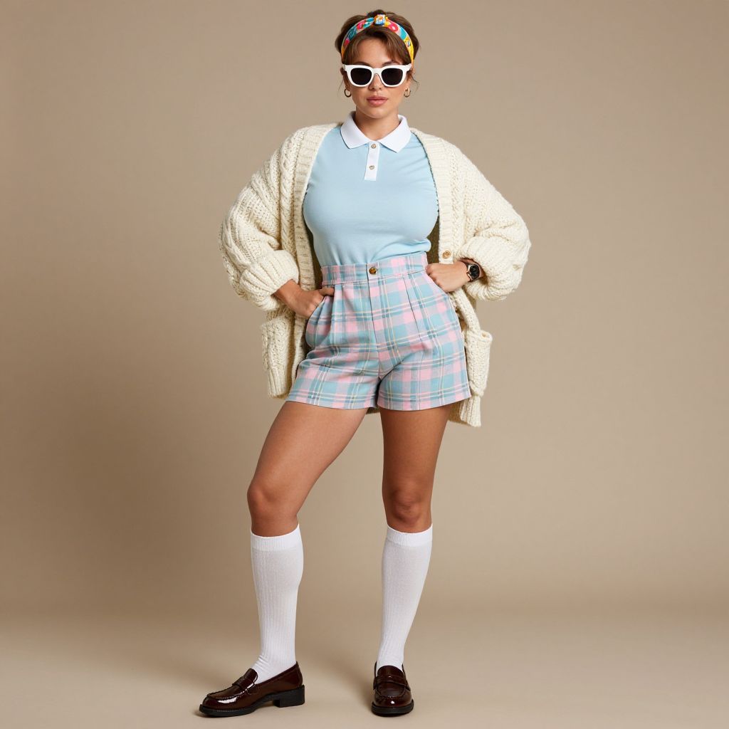 Full body shot, toned woman, pastel-colored polo shirt, crisp white collar, tailored high-waisted plaid shorts, soft cotton fabric, light blue and pink hues, oversized cable-knit cardigan, chunky knit, cream color, knee-high white socks, classic loafers, shiny leather, small gold hoop earrings, minimalistic watch, vibrant headband, playful patterns, retro sunglasses, vintage vibe, confident pose Sexy. Pretty face and beаutiful eyes. Big breasts