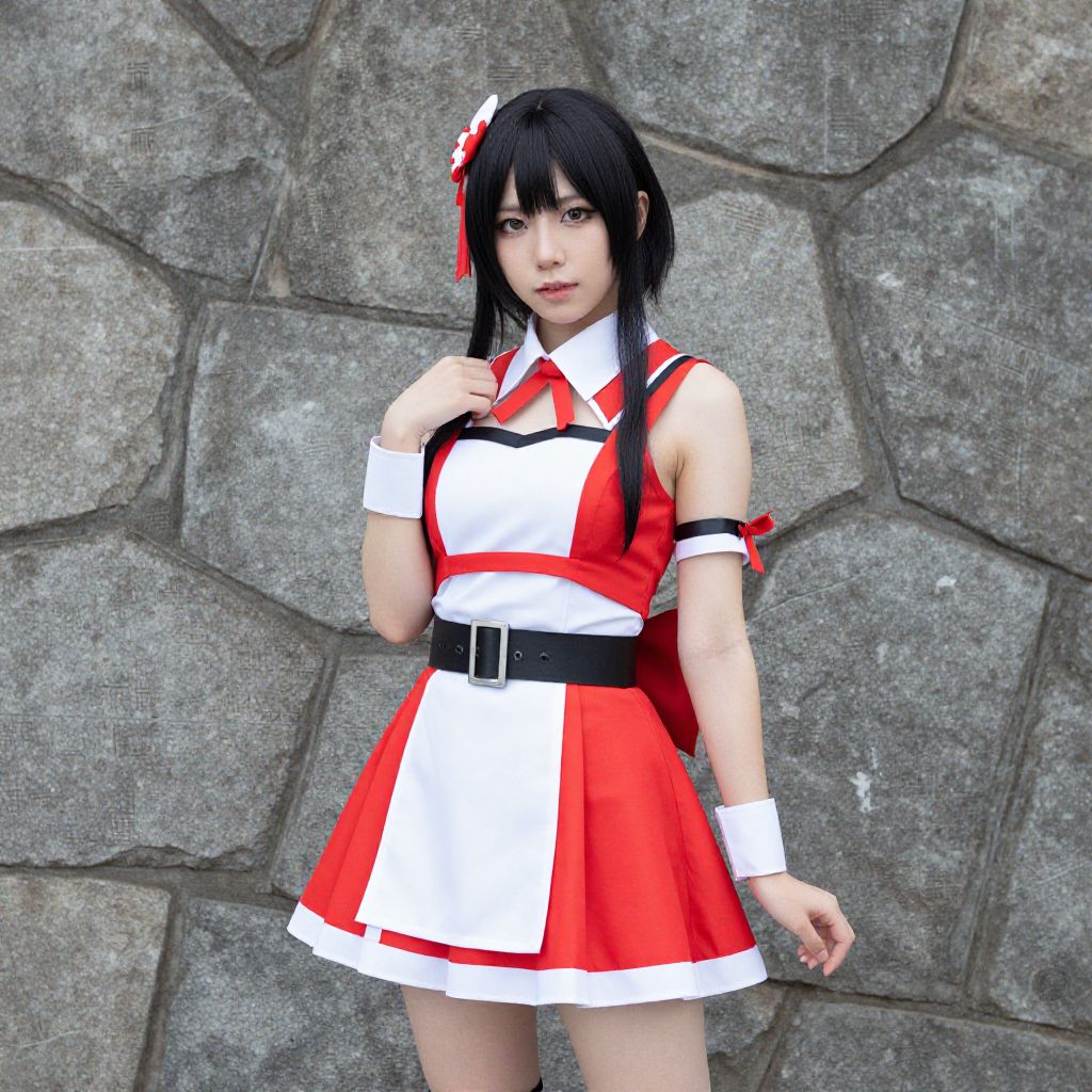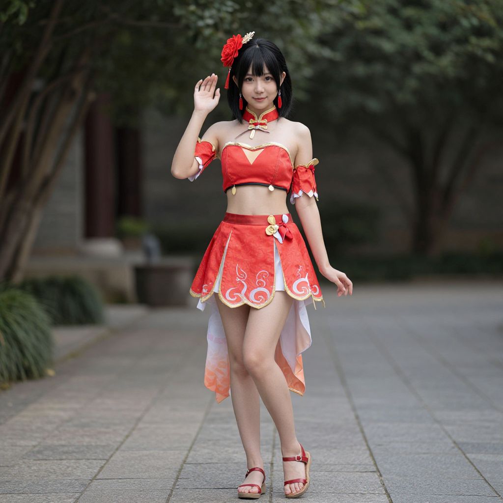 Photograph of an Asian woman with fair skin and black hair, styled with bangs and a red flower hairpiece. She wears a vibrant red, strapless crop top with white accents, and a matching, short, tiered skirt with white and orange gradient layers. Red flower-shaped embellishments adorn her skirt and she has red arm bands. She also wears red sandals. She is standing on a paved pathway in a garden-like setting with blurred greenery and trees in the background. She is smiling and waving with her right hand. The overall style is cosplay or costume play.