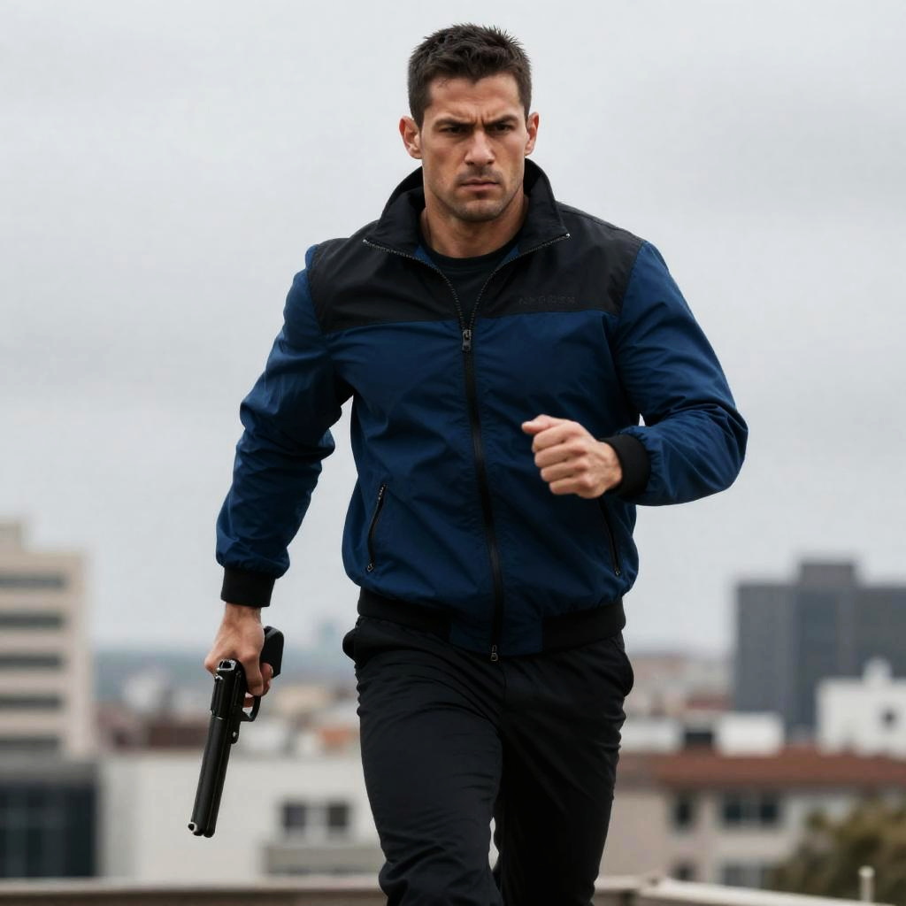 Photograph of a man with short dark hair, intense expression, wearing a black turtleneck, holding a gun, blurred motion. Background split into blue and yellow, with a city street and another person walking in the yellow section. White crosshair overlay.
