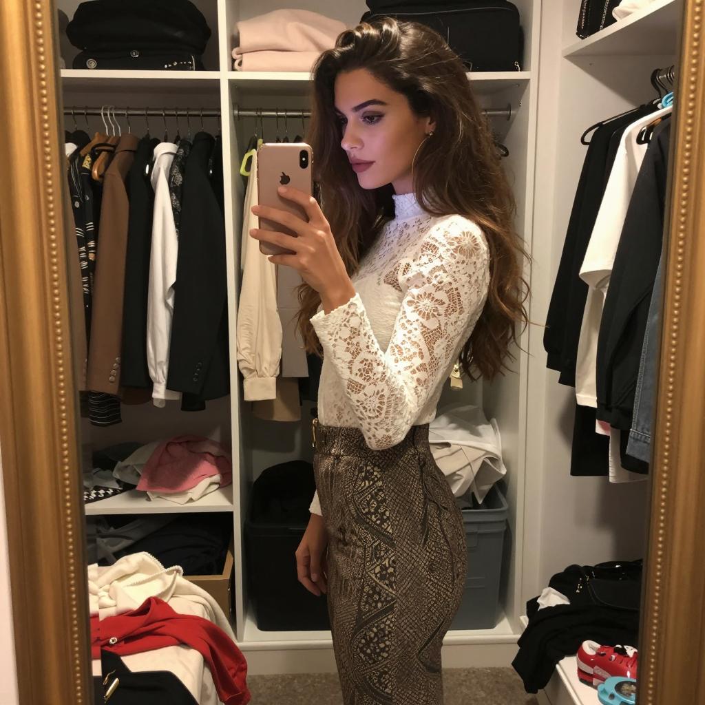 Woman in White Lace Crop Top Taking Mirror Selfie