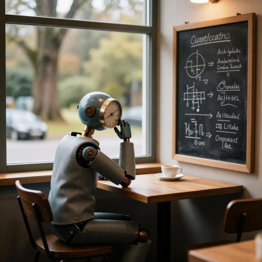 In a lantern-lit lighthouse study, a nostalgic pocket-watch automaton sits at a small table, gazing at tidal algorithms displayed on a chalkboard. Through the large window behind, a storm-lashed cliffs and bioluminescent bay adds to the tranquil atmosphere.