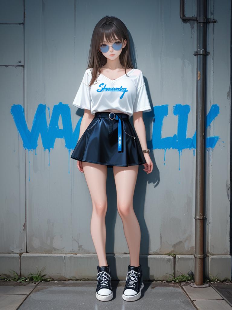 1girl, realistic face, full body shot, Woman, casual, white cropped graphic tee with bold lettering, scoop neck, short sleeves, black mini skirt with drawstring waistband, sheer hem detail, sunglasses with blue reflective lenses.