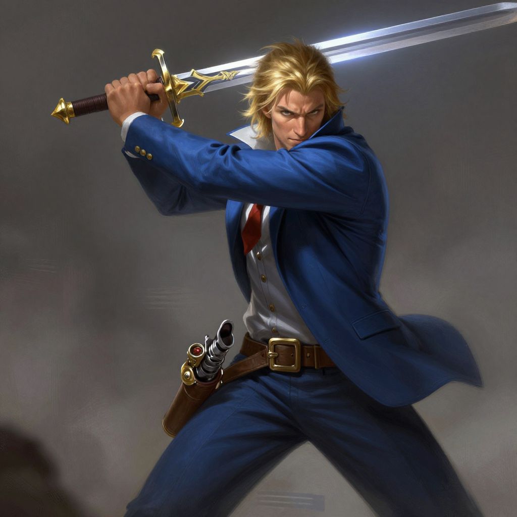 A man in a blue suit with blond hair swinging a sword and holding a pistol, fantasy, d & d, heartstone, digital painting, volumetric light, intricate, sharp, focus, bloom, illustration, highly detailed, concept art, matte, ruan jia, randy vargas, greg rutkowski