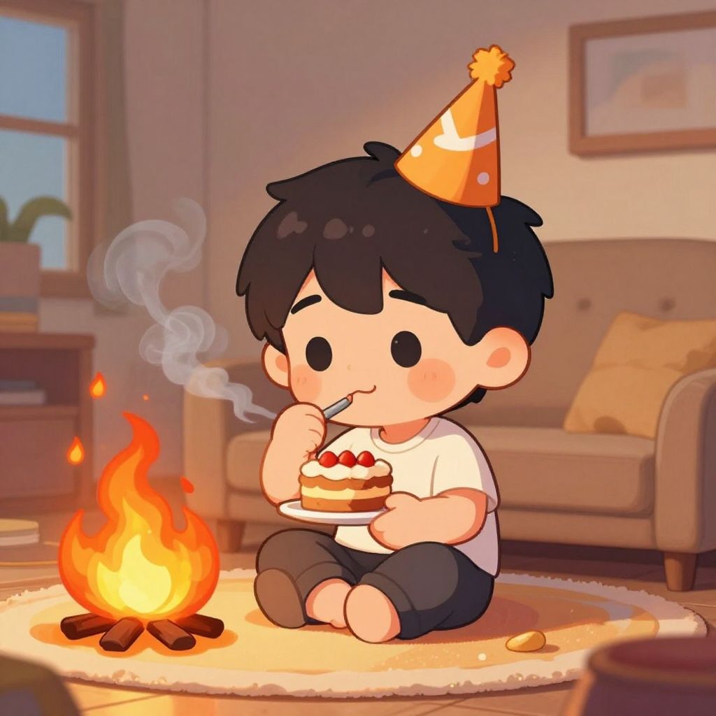 Solo, 1boy, cartoon, chibi, sitting, living room, (fire:1.0), smoke, burning, before and after, funny, bored, looking at viewer, smile, drinking, cake, happy birthday, birthday party, (flames:1.2), masterpiece, best quality, highly detailed