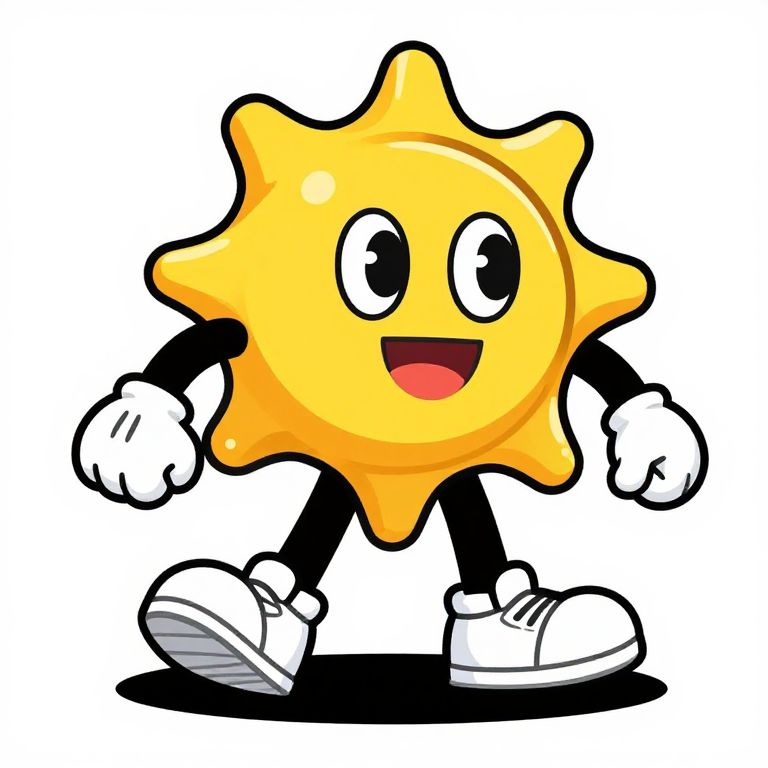 Tulle High quality vector illustration of a sun cuphead character in white gloves, wearing fashion sneakers in motion, thick outlines, white background,