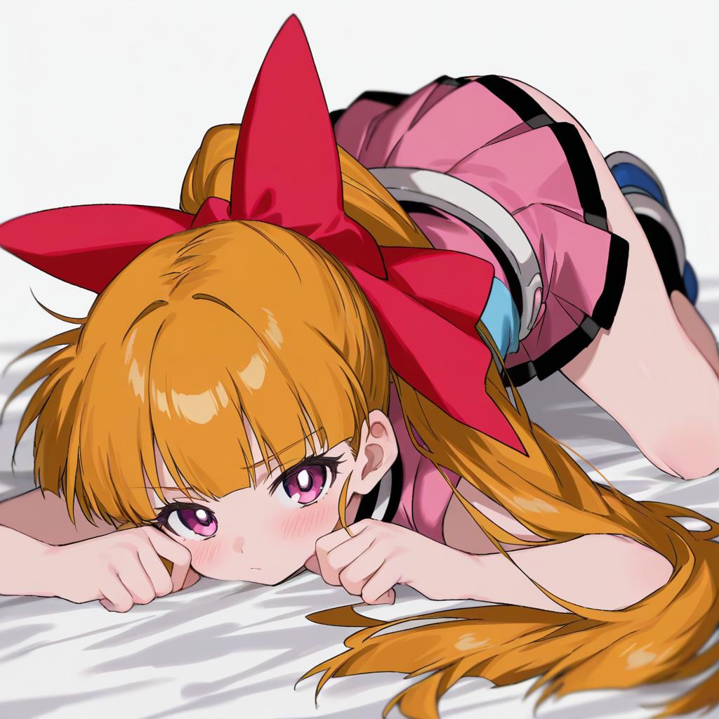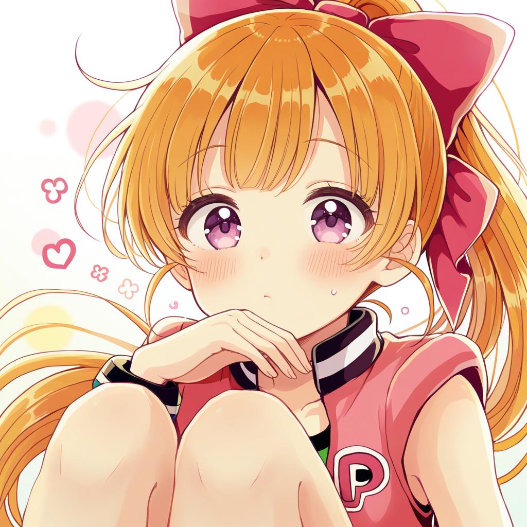 Akazutsumi momoko, powerpuff girls z, 1girl, red eyes, orange hair, long hair, very long hair, ponytail, hair bow, by artist sakura oriko, illustrious