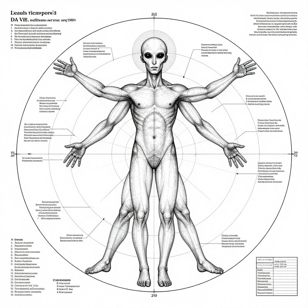 25 th century style da vinci's vitruvian man aliens 1989 version, scientific schematics alien proportions on a circle, blueprint, hyperdetailed vector technical documents, callouts, archviz, legend, patent registry