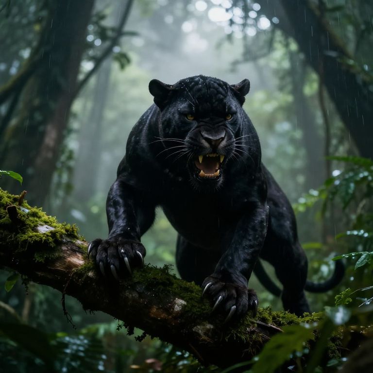 Photorealistic digital artwork of a fierce black panther with glossy, wet fur, baring sharp teeth and intense eyes, crouched on a moss-covered tree branch in a dense, misty forest. Raindrops are visible, adding a glistening effect to the panther's fur and the surrounding greenery. The background shows tall, blurred trees, creating a sense of depth and mystery. The panther's powerful, muscular body and large paws dominate the foreground, emphasizing its predatory nature. The scene is illuminated by soft, diffused light filtering through the forest canopy.