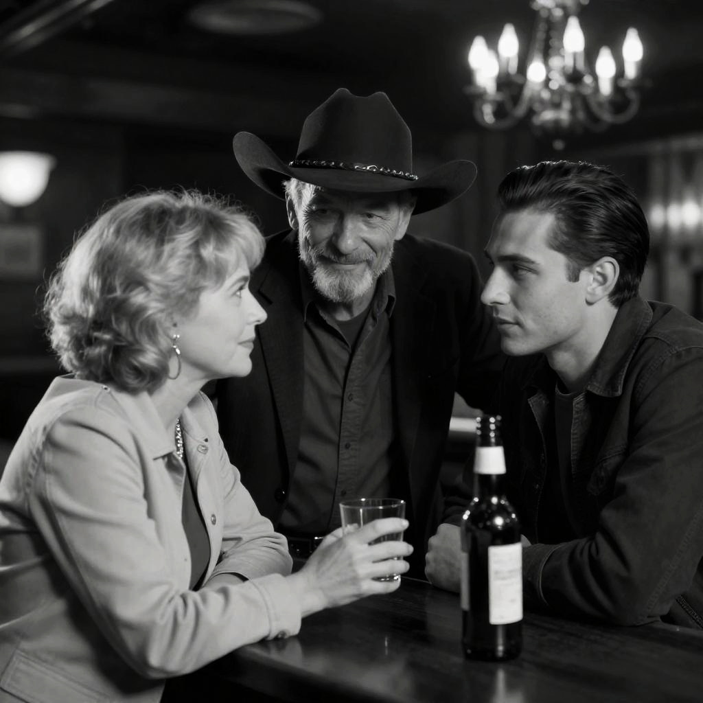 Black-and-white photograph of three people in a bar. Older man with cowboy hat, beard, leaning forward, smiling at woman with short blonde hair, light jacket, holding glass. Younger man with slicked-back hair, dark jacket, looking at woman. Bottle on table. Chandelier in background. Intense expressions on faces.