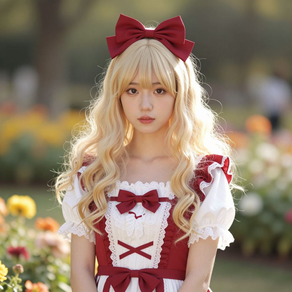 Photograph of a young woman with long, wavy blonde hair and a large red bow on top. She's wearing a red and white vintage-style dress with ruffled shoulders and lace trim. She's standing in a sunny garden with colorful flowers in the background. Her expression is calm and she's looking directly at the camera. The lighting highlights her hair and dress, giving a soft, warm glow to the image.