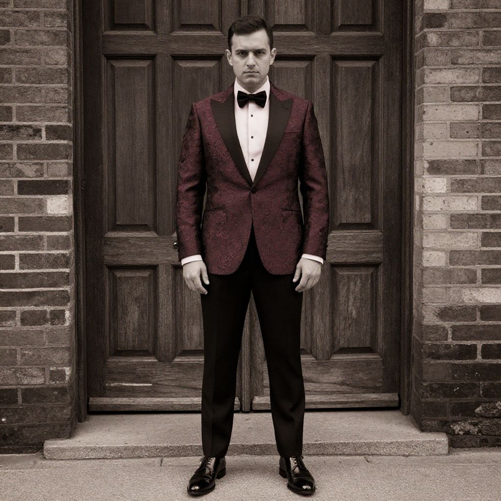 A man, burgundy floral brocade dinner jacket, light pink dress shirt, black silk bow tie, tailored black slacks, glossy black monk strap shoes, historic brick building, large wooden doors, sepia effect, confident expression. Man has masculine face and piercing eyes