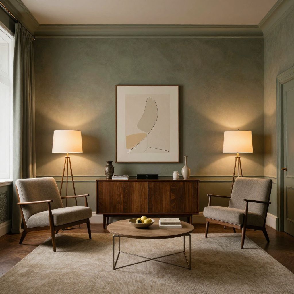 Photograph of a modern living room with a muted, olive-green wall featuring a large, abstract, white and beige silhouette painting. Two beige armchairs with dark wooden frames face each other, flanking a mid-century wooden cabinet. Two tripod-style lamps with beige shades sit on the cabinet's ends. A round wooden coffee table with a metal frame sits on a light beige rug, topped with a bowl of apples. Natural light filters through a window with dark curtains on the left, contrasting with the room's warm, ambient lighting.