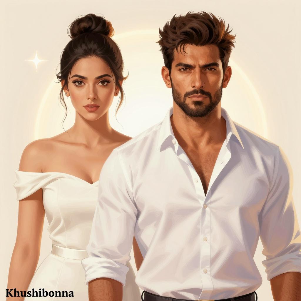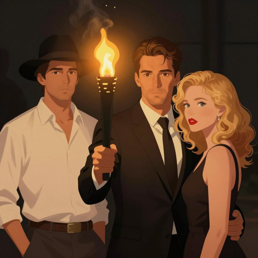 Digital illustration of two people with swords. Man with blond hair, beard, and bow tie stands on left. Woman with curly dark hair, white shirt, and serious expression stands on right. Swords crossed in front. Background: teal fabric, dark, and fire with glowing embers. Skull and cannon on right. Debris flying. Two people.