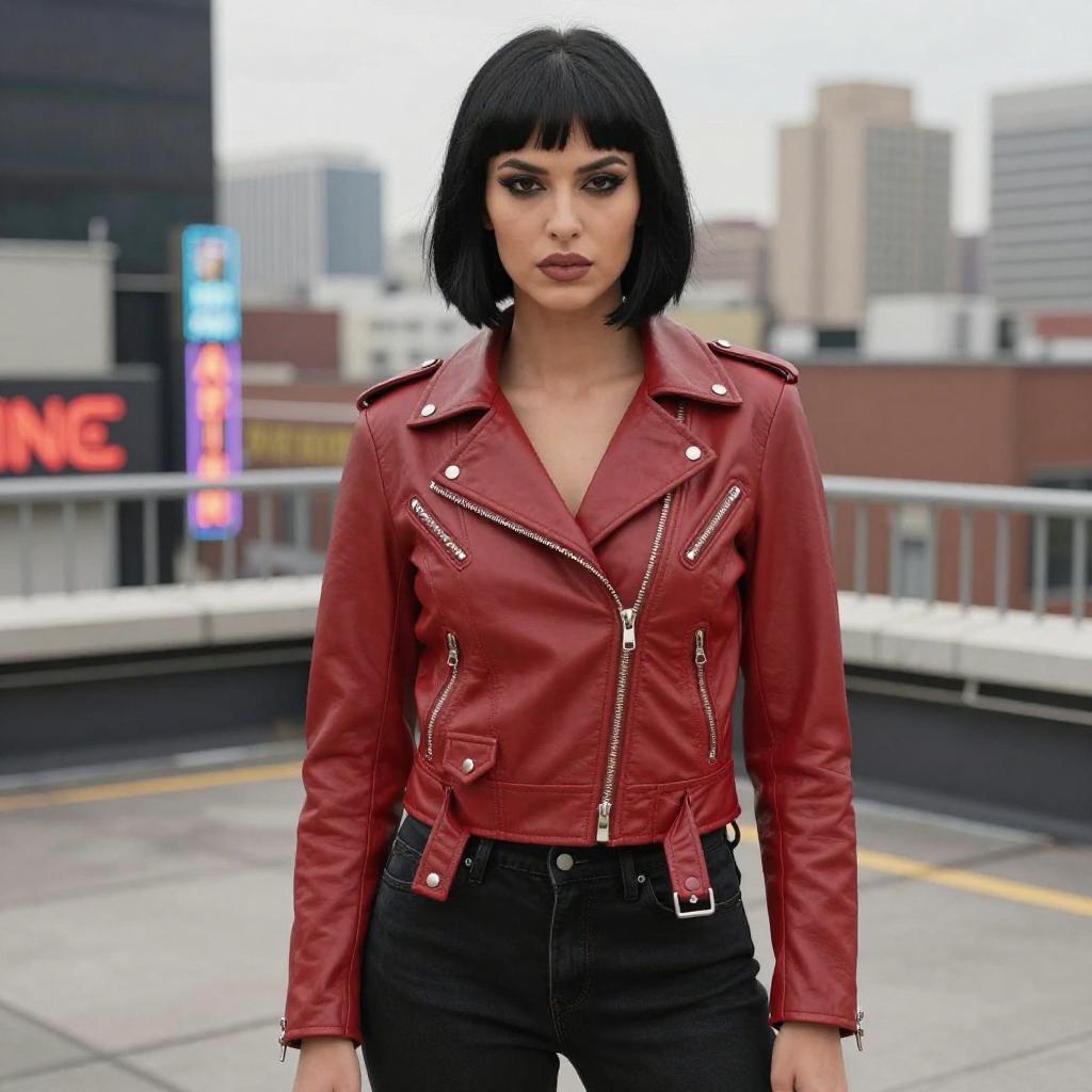 Photograph of a confident woman with a black bob haircut, wearing a red leather jacket with silver zippers and black high-waisted jeans. She stands on an urban rooftop with a blurred cityscape and neon signs in the background. Her makeup is bold, with dark eyeliner and lipstick. The rooftop has a metal railing and concrete surface. The overall style is edgy and urban.