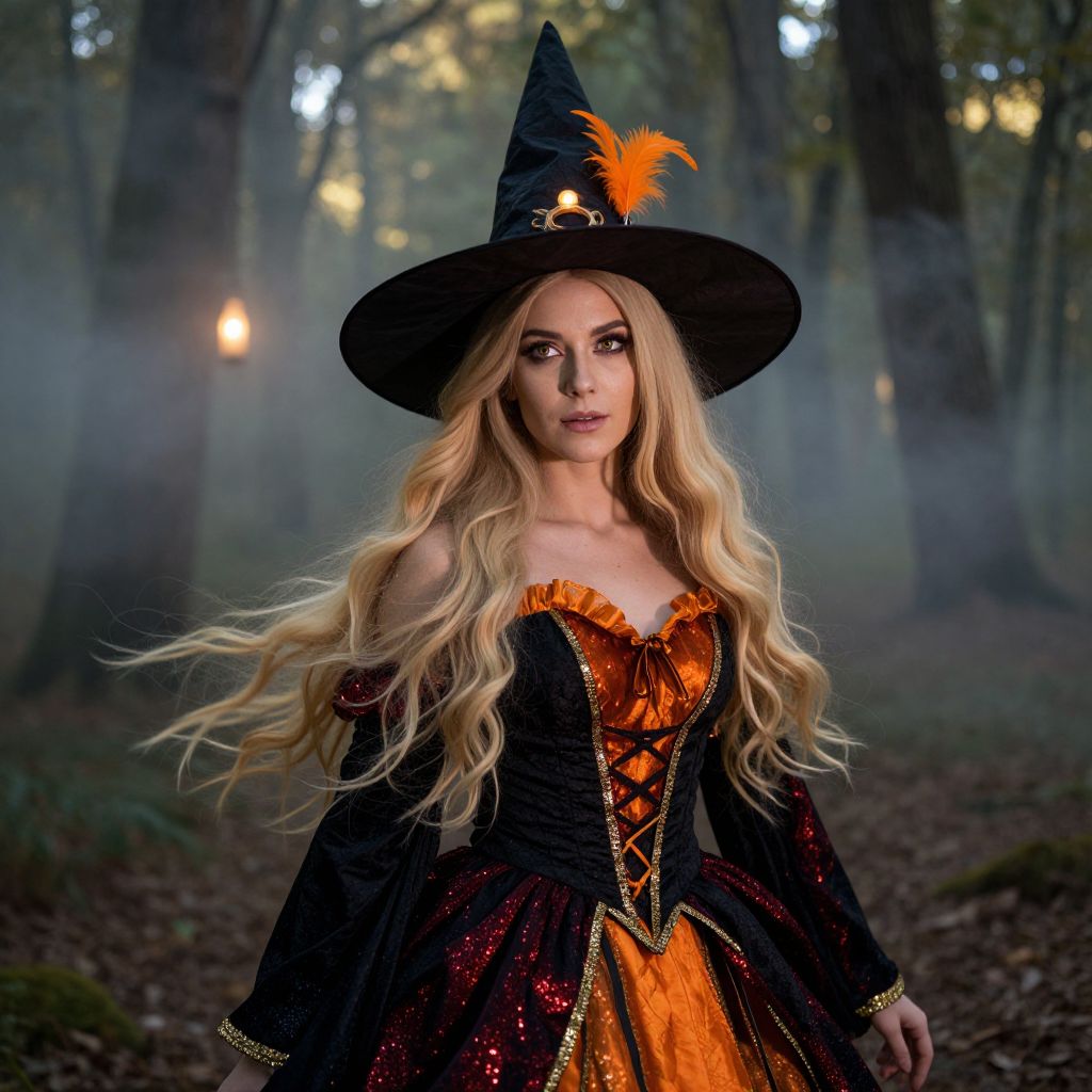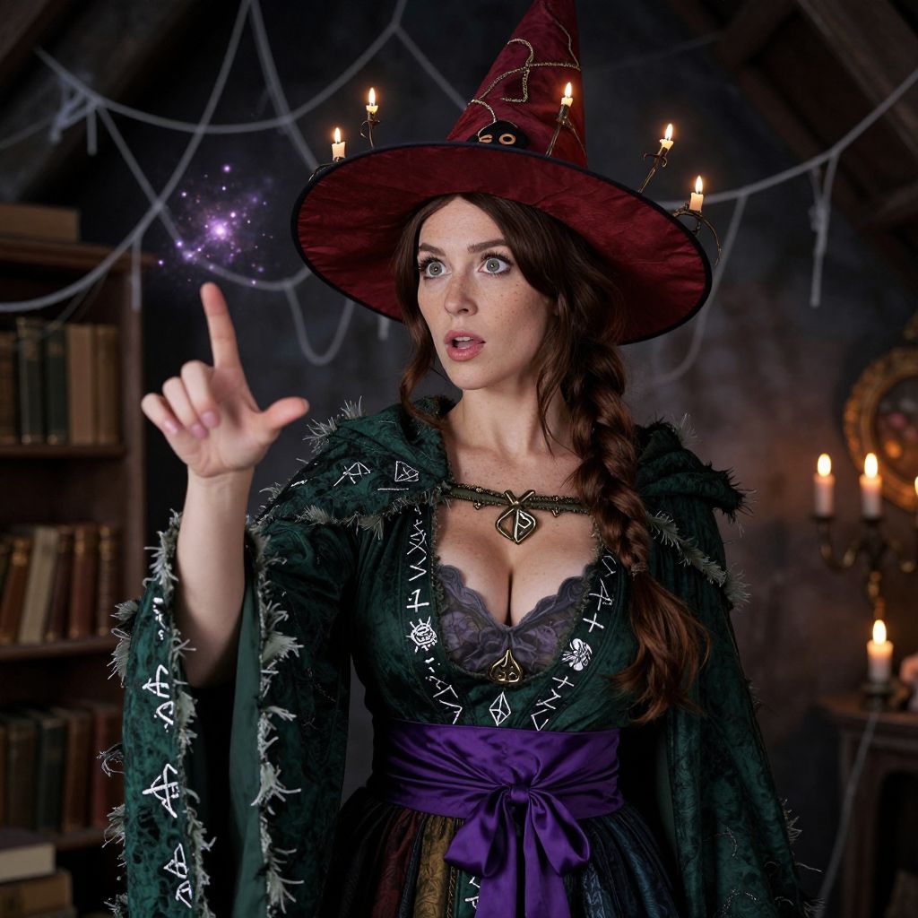 A close-up, cinematic photo of a woman wearing a detailed hocus pocus witch costume, including a tattered green cloak with silver runes, a red witch's hat adorned with tiny floating candles, and a wide purple sash. She has freckles, soft brown hair pulled into a braid, and a curious expression as she casts a shimmering spell in a dark, enchanted attic with cobweb-covered bookshelves and flickering candlelight.. The woman has big tits and cute face
