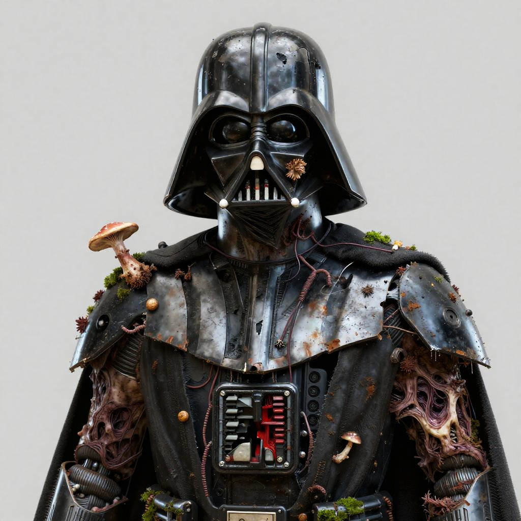 Digital hyper-realistic sculpture of zombie Darth Vader, cracked helmet, corroded armor, damaged cybernetics, wires poking out, jagged edges, bone exposed, gaping, half rotted face, fungal growth, mushrooms, spores, mycelium, moss, grime, rusted, malnourished, decrepit, emaciated, putrid, decomposition, deteriorating, aged, accruing, years of decay, tattered robes, decrepit cape, John Martin, Greg Rutowski, Sylvain Sarrailh, 60 volumetric