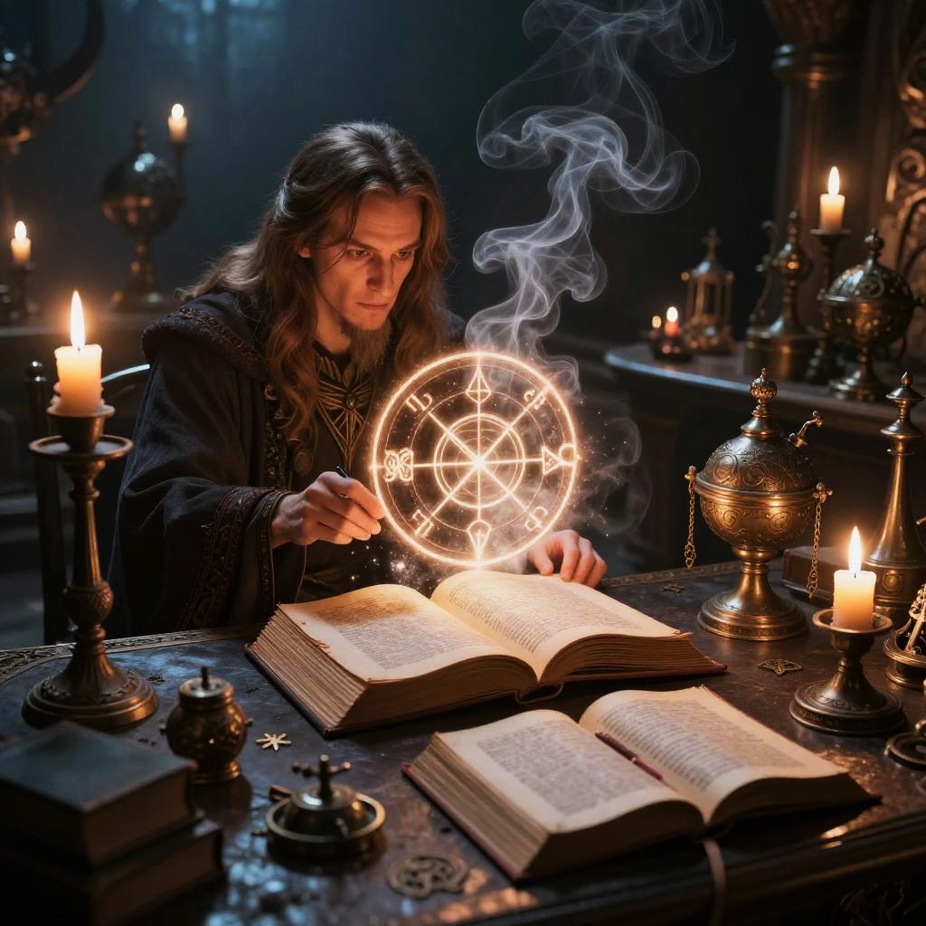 Magic AI art generator illustrating an ancient wizard's laboratory filled with shimmering spellbooks, glowing arcane symbols, and mystic devices, bathed in warm candlelight with ethereal smoke swirling around, fantasy concept art style.