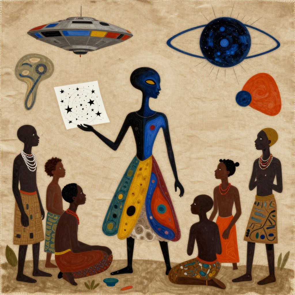 Tribal ethnic abstract organic indigenous, elegant extraterrestrial being meeting with people of Dogon tribe surrounding welcoming, holding chart of stars, painting made of natural dyes on textured textile cloth, style of Mali West-Africa, comprised of primitive abstract organic forms with vibrant natural colors, overhead spaceship from Sirius dogstar