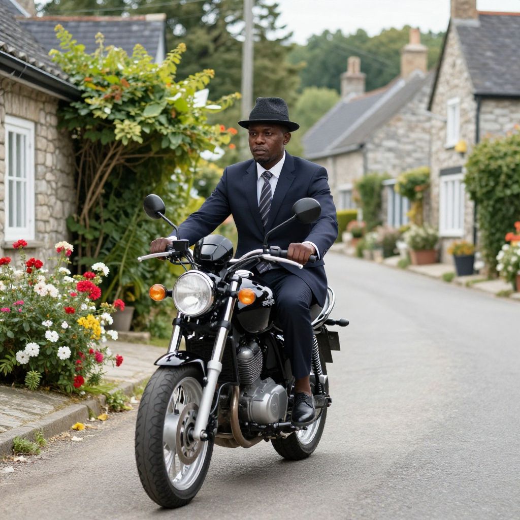 A sophisticated African man dressed in a tailored dark business suit, tie, and fedora hat riding a sleek black motorcycle along a narrow village road. The scene is set on a sunny early summer day with vibrant flowers and lush green foliage lining the stone cottages and street, creating a charming and elegant atmosphere.