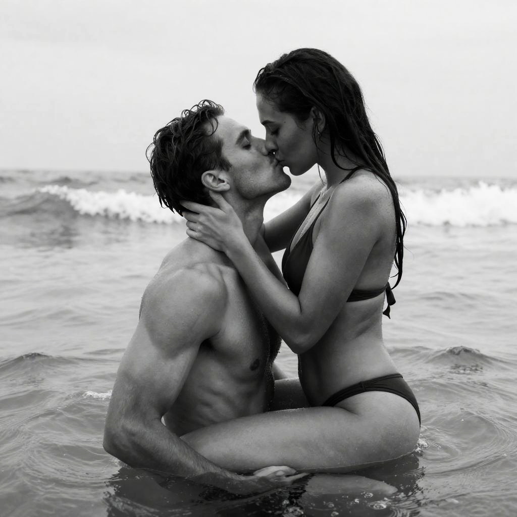 Photograph of a pool scene. Blonde woman in white heart-patterned bikini, angry expression, pushing brown-haired man with glasses, white striped shirt, kissing her ankle. Three other women in swimsuits in background. "Frog Do It In The Water" banner. Bright daylight.