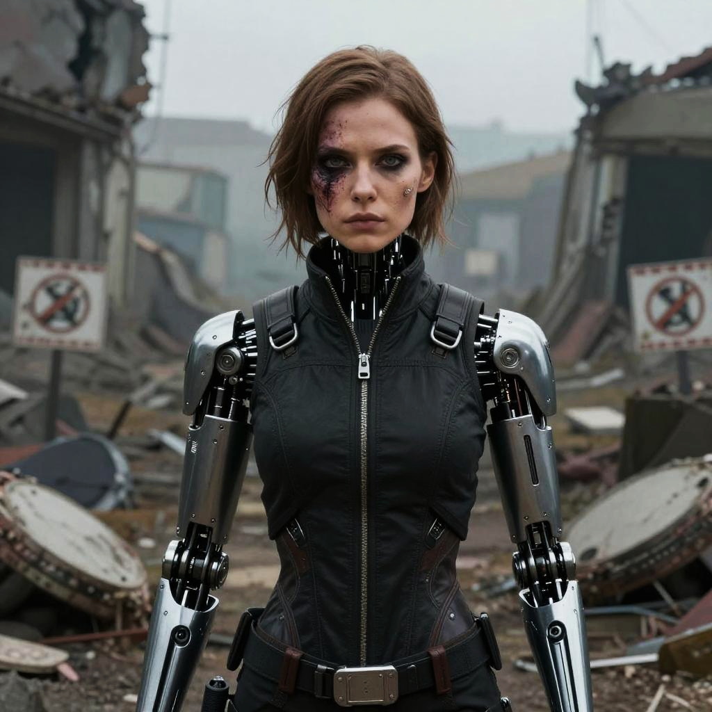 Realistic photo.Exposure Bracketing sci-fi grimdark setting, agile female with a disfigured face and a robotic arm, wearing a sleek black vest, standing with a stoic expression with ruins and signs of warfare behind her realistic photo