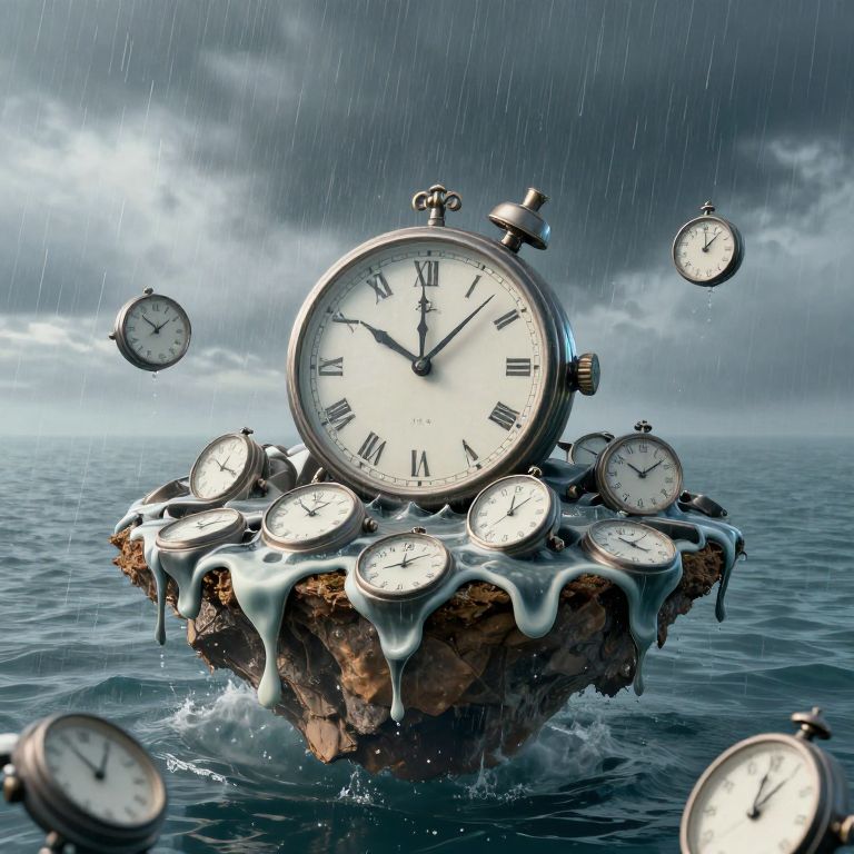 An ocean of melted clocks ripples beneath a floating island where time flows from the sky like rain, affecting all at inconsistent rates.