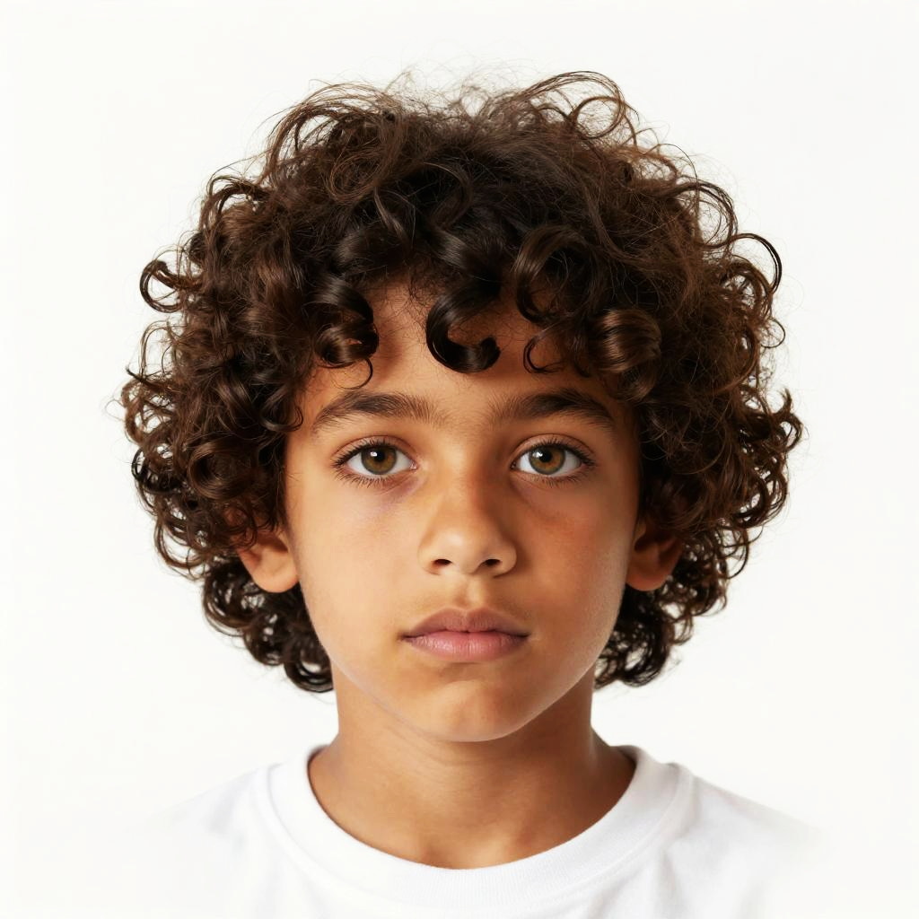 Realistic photo.The drawing depicts a Brazilian boy named Lucas, who is both timid and adventurous. His curly dark brown hair cascades down in loose waves, framing his face and ending just above his shoulders. His bright hazel eyes are large and expressive, giving him a curious and alert look. Lucas's face is slightly rounded, with a small nose and full lips that seem to hint at a quiet but confident personality - Upscaled (Light) by. realistic photo