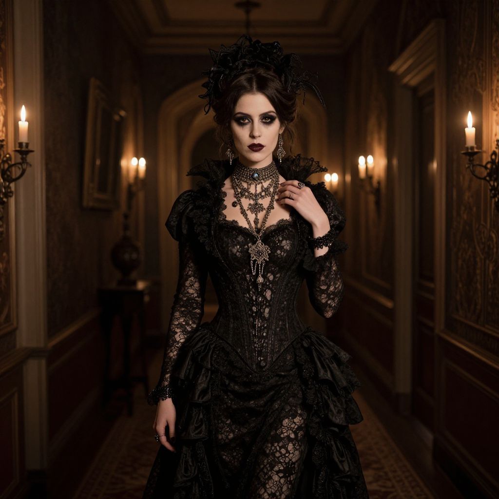 Victorian beautiful gothic woman standing in a shadowy Victorian mansion hallway, wearing an elaborate black lace dress with dark makeup, intricate jewelry, and a mysterious, enigmatic expression, dim candlelight flickering around her.