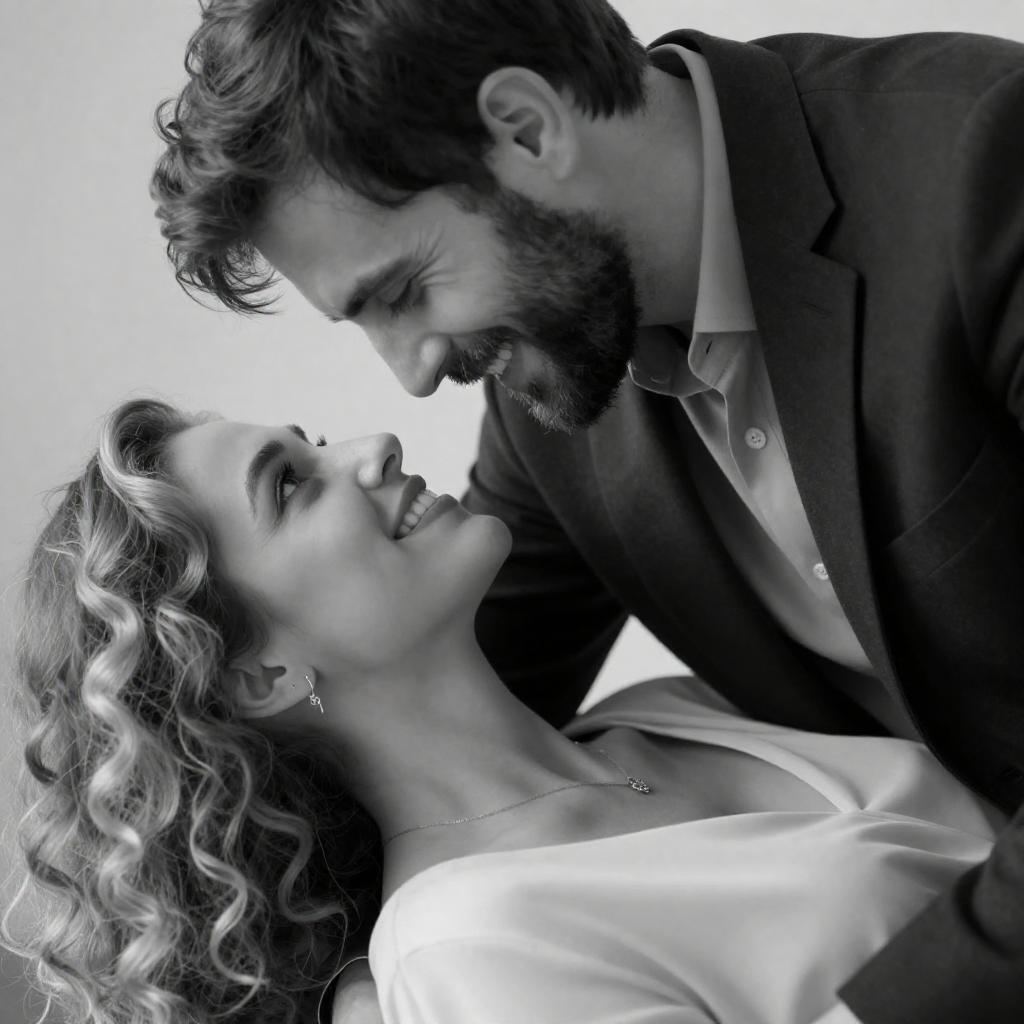 Black-and-white photograph of a man with dark hair and beard, smiling, leaning over a woman with curly blonde hair, smiling up at him. She is wearing a light-colored top, he is in a dark suit. Close-up, intimate pose.