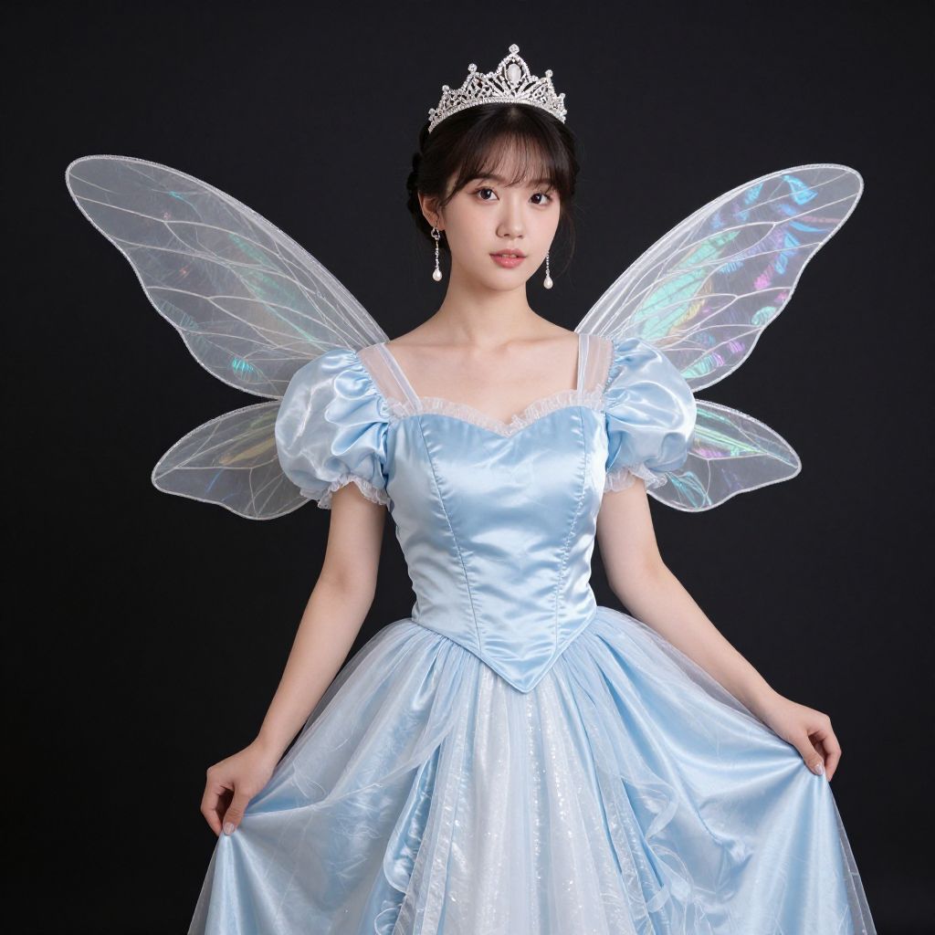Photograph of an East Asian woman in a light blue, satin princess dress with iridescent wings and a silver tiara, against a black background