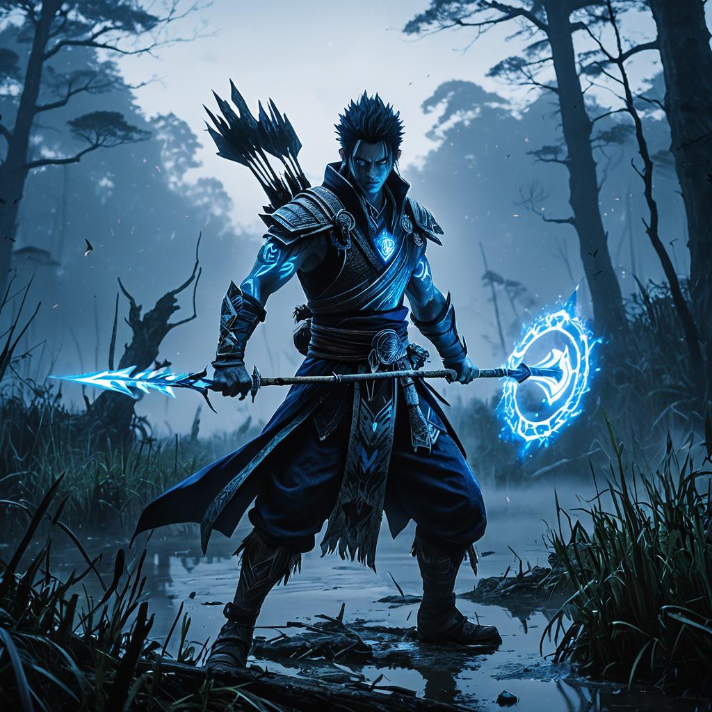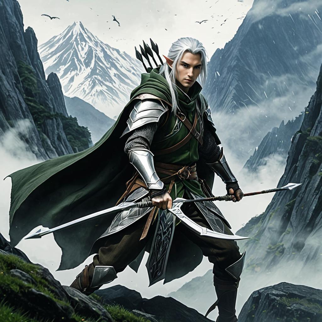 A fantasy-themed elven ranger with sleek silver hair and pointed ears, dressed in dark green and armored clothing, holding a bow and arrow in a misty, rugged mountain landscape. The scene captures a dramatic and action-ready pose, inspired by anime style.
