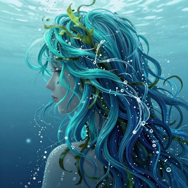 Water genasi hair depicted as dynamic streams of water interwoven with seaweed and tiny glowing bubbles, colors shifting from turquoise to navy blue, set against a misty ocean background, fantasy art with vivid details and rich textures, magical and enchanting mood.