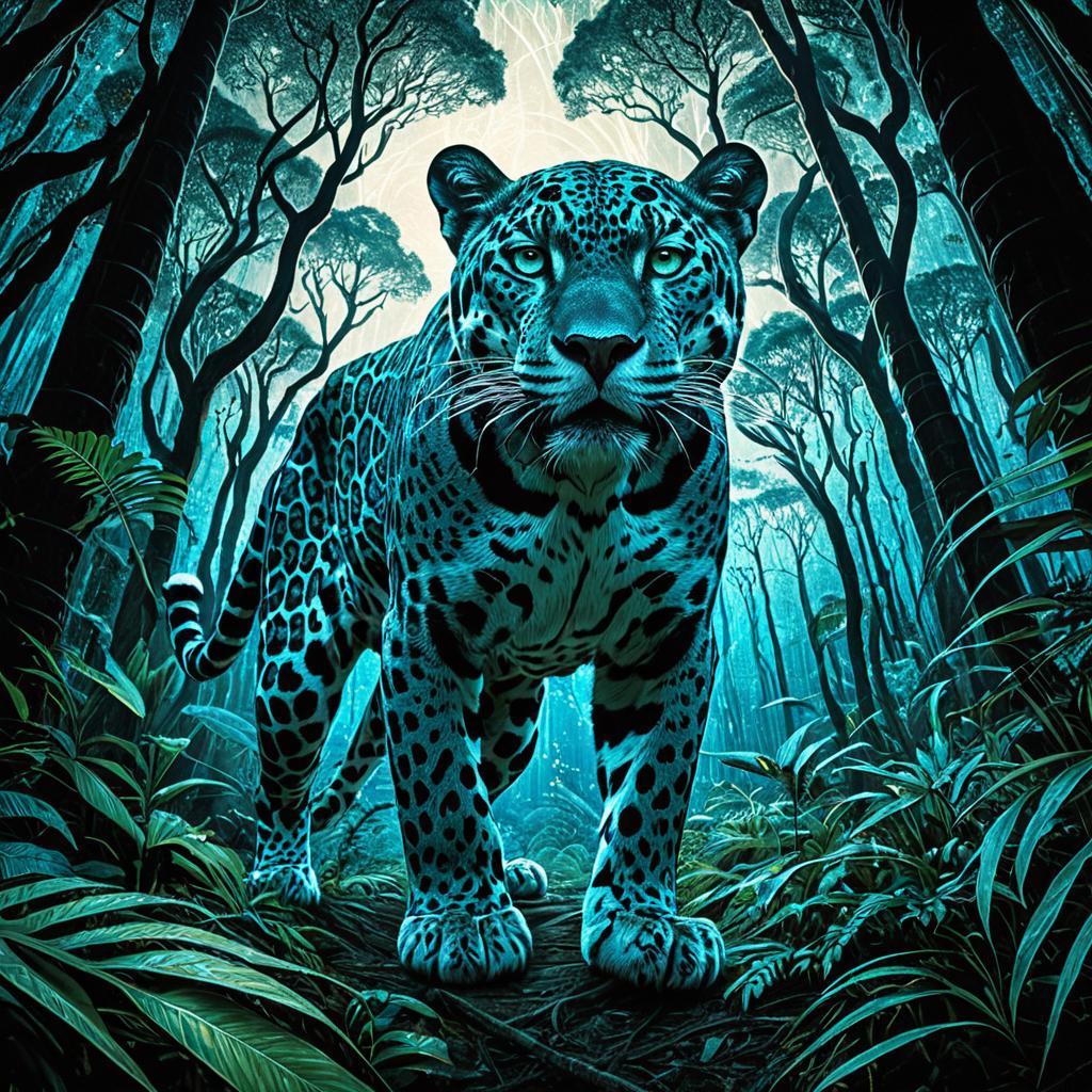A luminous jaguar stands on a moss-covered log in a dense ancient jungle illuminated by surreal blue-green bioluminescent light. The jungle features tall trees with intricate fractal-like canopies, glowing veins, and dense foliage. The scene is rendered in vivid detail with a cinematic wide-angle perspective and volumetric lighting, blending glitch textures and surreal distortions inspired by notable artists. The jaguar's striking glowing pattern and intense gaze create a mystical atmosphere.
