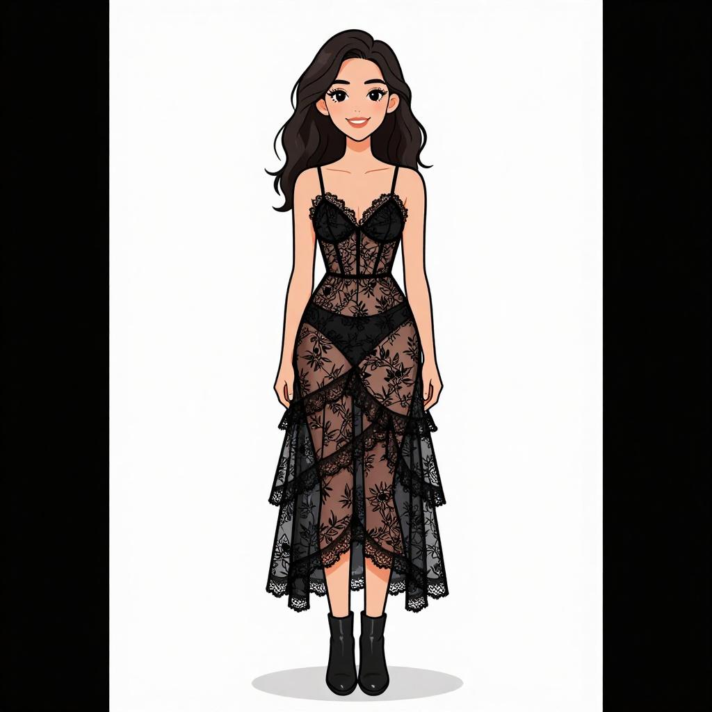 Woman with pretty face and pretty hair. smiling Woman, romantic gothic, sheer black lace maxi dress, spaghetti straps, V-neckline, visible black bodysuit underneath, ruffled lace trim, asymmetrical tiered skirt, ankle boots in matte black leather, minimalist white studio background. --sref 1467