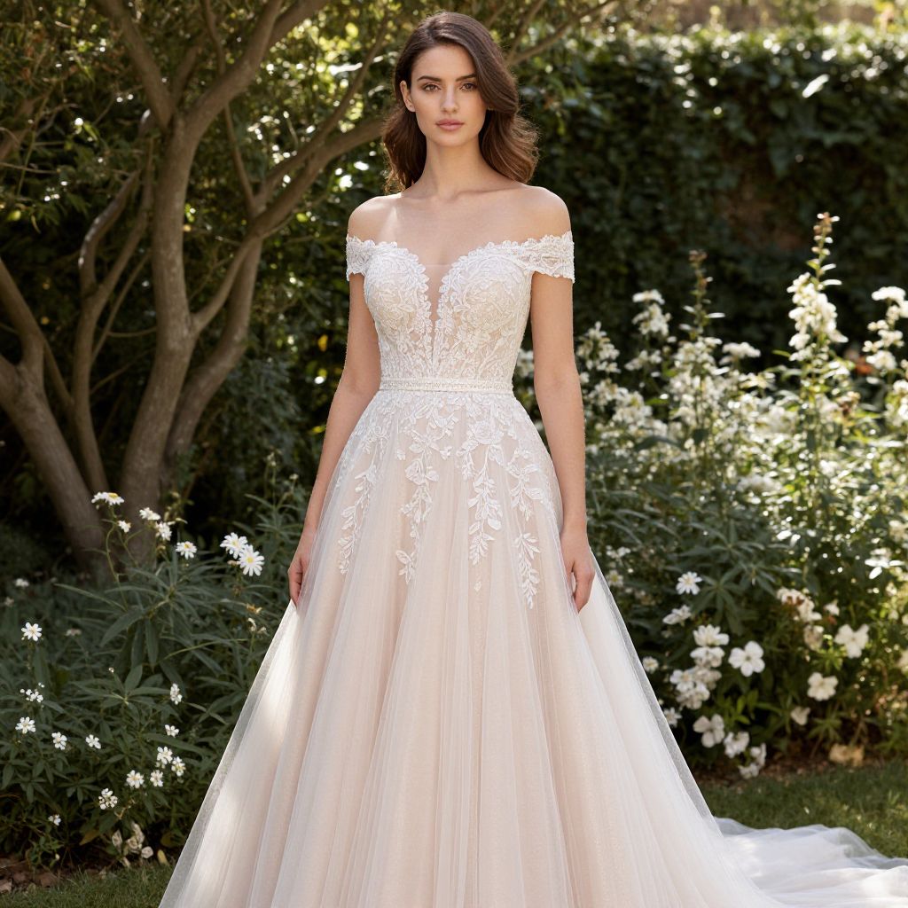 A woman, romantic bridal, off-the-shoulder lace bodice, intricate floral embroidery, sheer illusion neckline, cap sleeves, fitted waist, soft blush pink A-line skirt, multiple layers of tulle, floor-length, subtle sparkle, mirrorless effect, clean lines, sharp focus, standing in a lush garden, blooming flowers, dappled sunlight, elegant pose, serene expression Sexy. Pretty face and beаutiful eyes. Big breasts