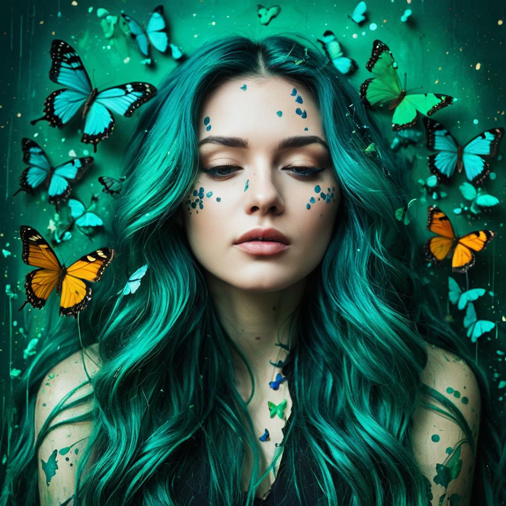 Fantasy portrait of a woman with flowing magenta hair, eyes closed in a peaceful expression. Surrounded by vibrant, ethereal butterflies in shades of golden, some delicately resting on her face and shoulders. Her makeup is bold and matching, with vivid crimson tones. Soft splashes of paint and abstract splatters create a dreamlike, artistic atmosphere around her.