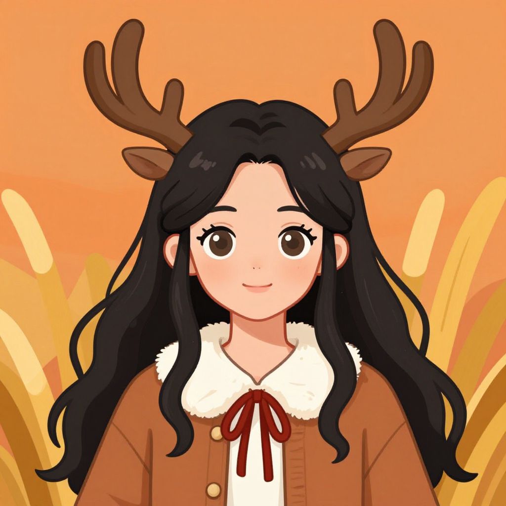 This digital anime-style drawing features a young woman with long, wavy black hair and large brown eyes. She wears a brown jacket with a white fur collar and a red ribbon tie, and she has brown reindeer antlers on her head. The background is an orange gradient with yellow, abstract shapes resembling corn stalks. The woman has a gentle smile and a fair complexion. The overall style is vibrant and colorful, with a warm, autumnal theme.