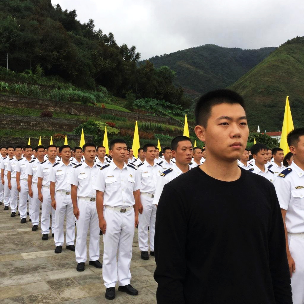 Five male soldiers in light green uniforms with short hair, standing in a row. They hold white circular objects, have serious expressions, and wear medals and shoulder cords. Blurred background. Soldier on far right looks surprised.